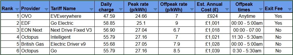 Figure 1. EV electricity tariff comparison table including time of use rates